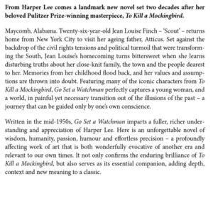 Maycomb, Alabama. Twenty-six-year-old Jean Louise Finch – ‘Scout’ – returns home from New York City to visit her ageing father, Atticus. Set against the backdrop of the civil rights tensions and political turmoil that were transforming the South, Jean Louise’s homecoming turns bittersweet when she learns disturbing truths about her close-knit family, the town and the people dearest to her.