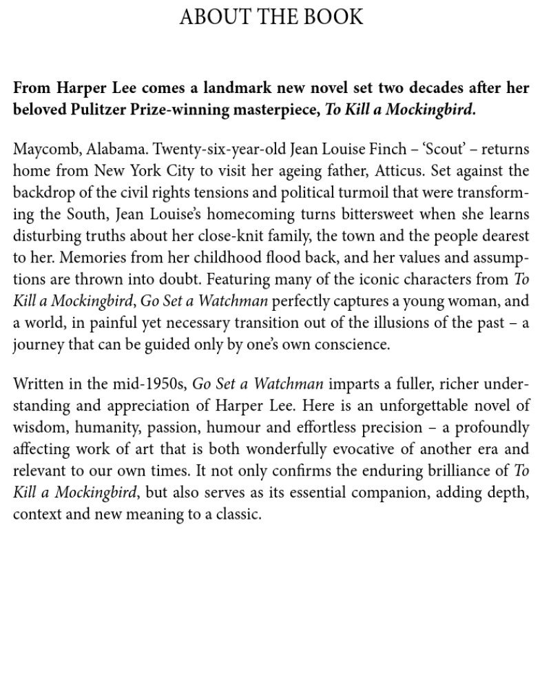 Written in the mid-1950s, Go Set a Watchman imparts a fuller, richer understanding and appreciation of Harper Lee. Here is an unforgettable novel of wisdom, humanity, passion, humour and effortless precision – a profoundly affecting work of art that is both wonderfully evocative of another era and relevant to our own times. It not only confirms the enduring brilliance of To Kill a Mockingbird, but also serves as its essential companion, adding depth, context and new meaning to a classic.